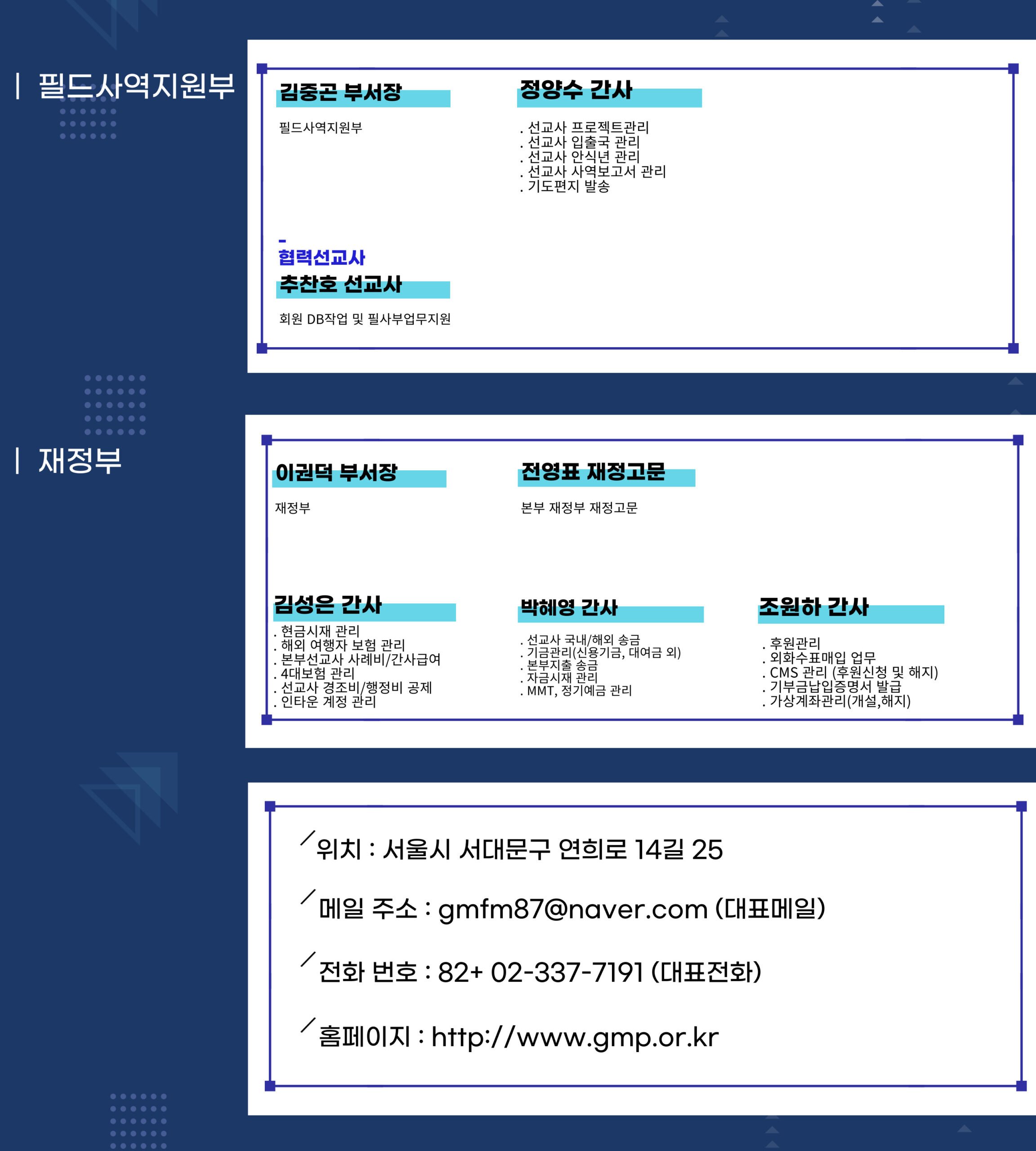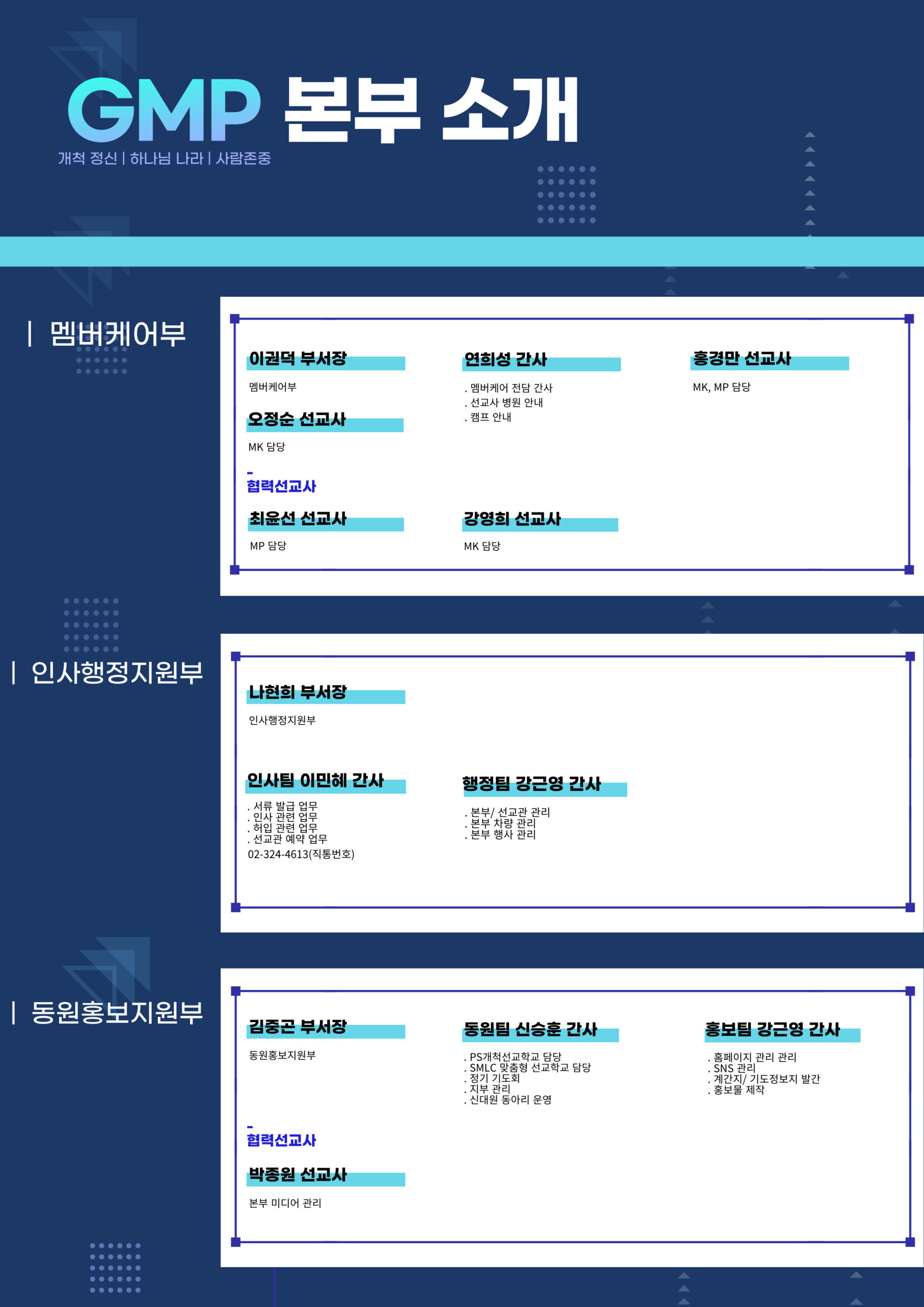 30여년 전 한국교회는 그 동안의 한국교회 내 선교운동의 결실을 세계선교의 발전에 좀더 발전적으로 기여하자는 취지 하에 이태웅, 이동원, 홍정길, 옥한흠, 하용조 목사님이 뜻을 같이하여 초교파 선교 사단법인 한국해외선교회(GMF)를 설립하였습니다. 1987년에는 그 산하에 국제적 경험과 한국교회의 특성을 조화시킬 수 있는 한국적 해외선교 사역부로 개척선교부(GMP)를 창립하였습니다. 현재 GMF는 파송단체(3), 훈련기관(2), 연구기관(1), MK 지원단체(1), 선교사 재교육지원단체(1) 등 10개의 단체로 구성된 한국의 대표적인 초교파 선교기구로 발전하였습니다. GMP는 복음이 필요한 지역, 영역, 종족 가운데 그리스도의 몸된 공동체를 개척하고 섬기고 온전케 하여 총체적으로 하나님 나라 확장에 참여함으로 하나님을 영화롭게 하는 것을 사명으로 하고 있습니다. 지난 30여년간 GMP는 개척 정신 하에 교회개척 사역, 학원사역, 의료사역, 제자훈련, 문화사역, 성경 묵상 사역, 스포츠 사역, 농업사역, BAM 등 다양한 선교 사역들을 감당해 왔습니다. GMP는 복음을 새롭게 들을 필요가 있는 미개척지들과 미전도 국가, 그리고 복음을 통한 변화가 필요한 영역들을 계속 개척해 나가고 있습니다. 이와 함께 회원 선교사들이 개척한 현지 교회들이 현지인 선교사들을 파송하는 교회들로 전환할 수 있도록 전략적으로 지원하고자 합니다.